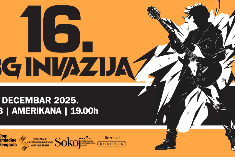 BG Invazija se vraća — jača nego ikad! Pozivamo vas na 16. po redu takmičenje bendova beogradskih gimnazija, koje će se održati u sali Amerikana Doma omladine Beograda, 18. decembra, sa početkom u 19:00. Na sceni vas očekuju neki od najtalentovanijih mladih muzičara iz beogradskih gimnazija, koji će se boriti za titulu najboljeg školskog benda ove godine. Publiku čeka energična svirka, obrade domaćih i stranih kao i autorske pesme, fantastična atmosfera i pravo lice beogradske omladinske muzičke scene.