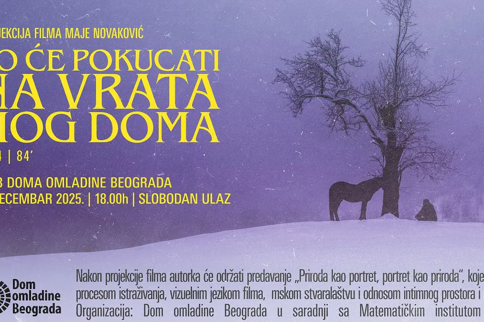 Dom omladine Beograda u saradnji sa Matematičkim institutom SANU, organizuje besplatnu projekciju dokumentarnog filma „Ko će pokucati na vrata mog doma“ (2024, 84’) autorke Maje Novaković. Smešteno u surov, ali prelep krajolik Bosne i Hercegovine, ovo ostvarenje otkriva unutrašnje, nematerijalne sfere kroz strpljivo posmatranje prirodnog sveta. Nakon projekcije autorka će održati predavanje „Priroda kao portret, portret kao priroda“, koje se bavi procesom istraživanja, vizuelnim jezikom filma, značajem pejzaža u filmskom stvaralaštvu i odnosom intimnog prostora i naracije.