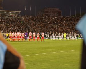 Domaći tim je uspeo da se vrati u meč pred odlazak na odmor. U završnici prvog poluvremena Čukarički je imao najbolji period igre, a posle akcije sa desne strane Tedić je prvo pogodio stativu, da bi se lopta potom odbila do Sisea koji je ispred Rodrigaa uspeo da savlada Mateusa i smanji na 2:1.