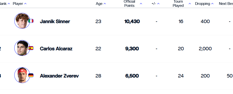 Na vrhu i dalje dominira Janik Siner sa 10.430 bodova.