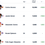 Srpski as trenutno ima 4.830 bodova, dok ga prate Feliks Ože-Alijasim (4.245), Tejlor Fric i Aleks de Minor, koji su izjednačeni sa po 4.135 poena.