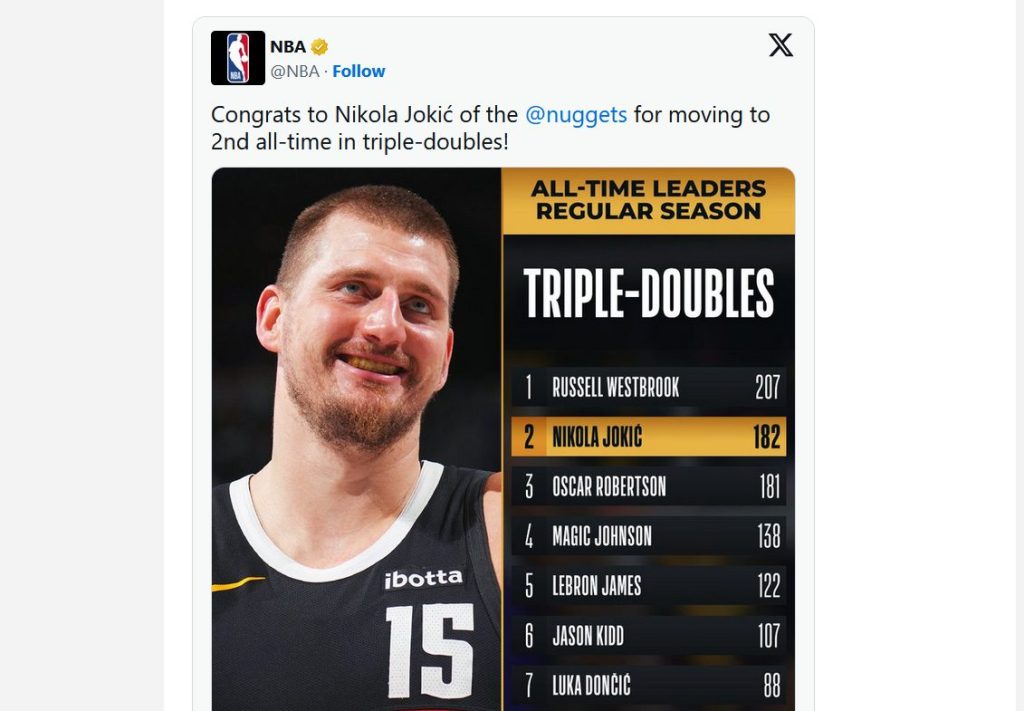 Iz igre je imao 7/12, za tri 2/2, a sa linije penala 6/6. Takođe, na listi igrača sa tripl-dablom u regularnom delu sezone pretekao je Oskara Robertsona (181) i ispred njega je sada samo Rasel Vestbruk (207).