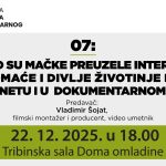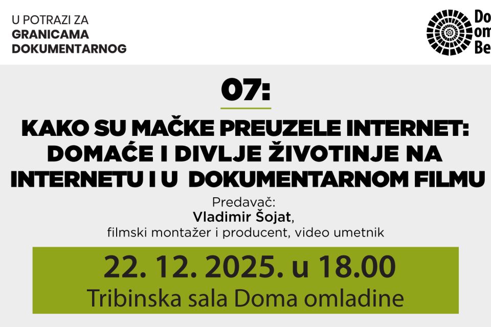 Poslednje predavanje iz ciklusa „NOVI DOKUMENTARIZAM (DOKUMENTARNI FILM, NOVE TEHNOLOGIJE, NOVI TRENDOVI)“ u ovoj godini, zakazano je za ponedeljak, 22. decembar od 18 časova u Tribinskoj sali Doma omladine Beograda. Vladimir Šojat, filmski montažer, producent i video umetnik, govoriće o domaćim i divljim životinjama na internetu i u dokumentarnom filmu. Ulaz je slobodan.