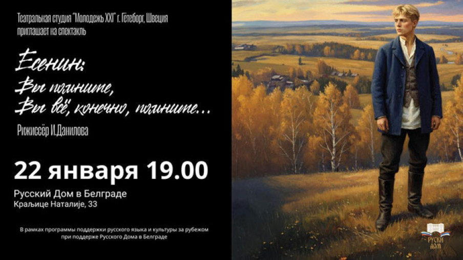 Pozorišni studio iz švedskog Geteborga „Mladost 21. veka” predstaviće poklonicima umetnosti originalnu predstavu na ruskom jeziku, inspirisanu delima Sergeja Jesenjina: „Vi pamtite – Vi, naravno, sve pamtite”.