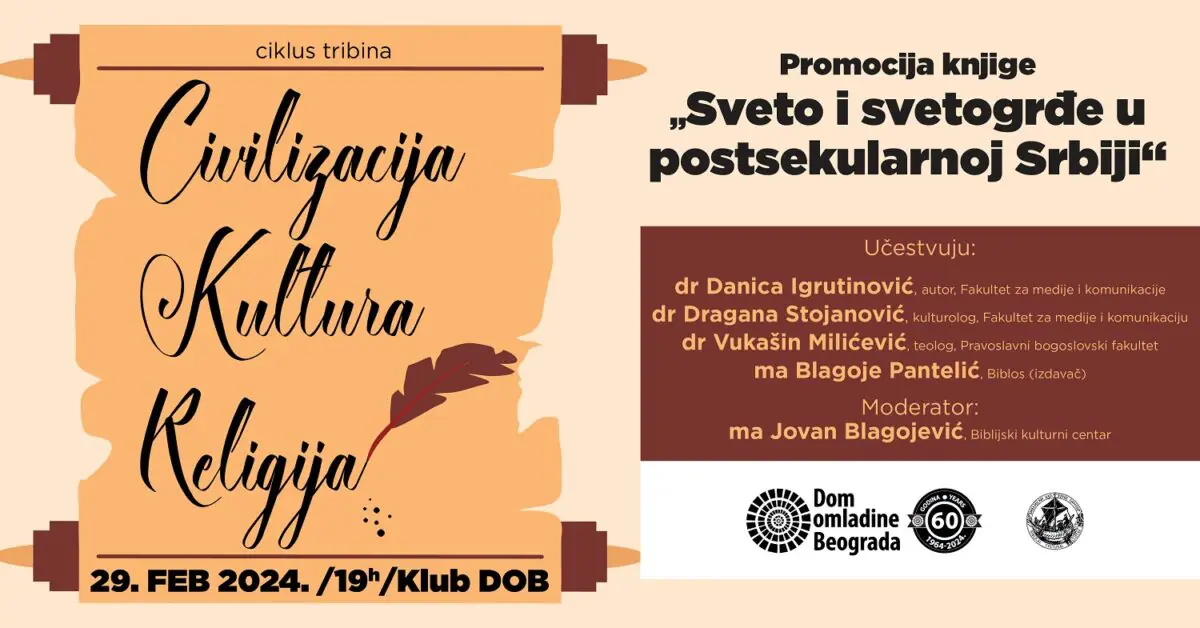 U četvrtak, 29. februara u 19 časova u klubu Doma omladine Beograda biće održana promocija knjige „Sveto i svetogrđe u postsekularnoj Srbiji“.